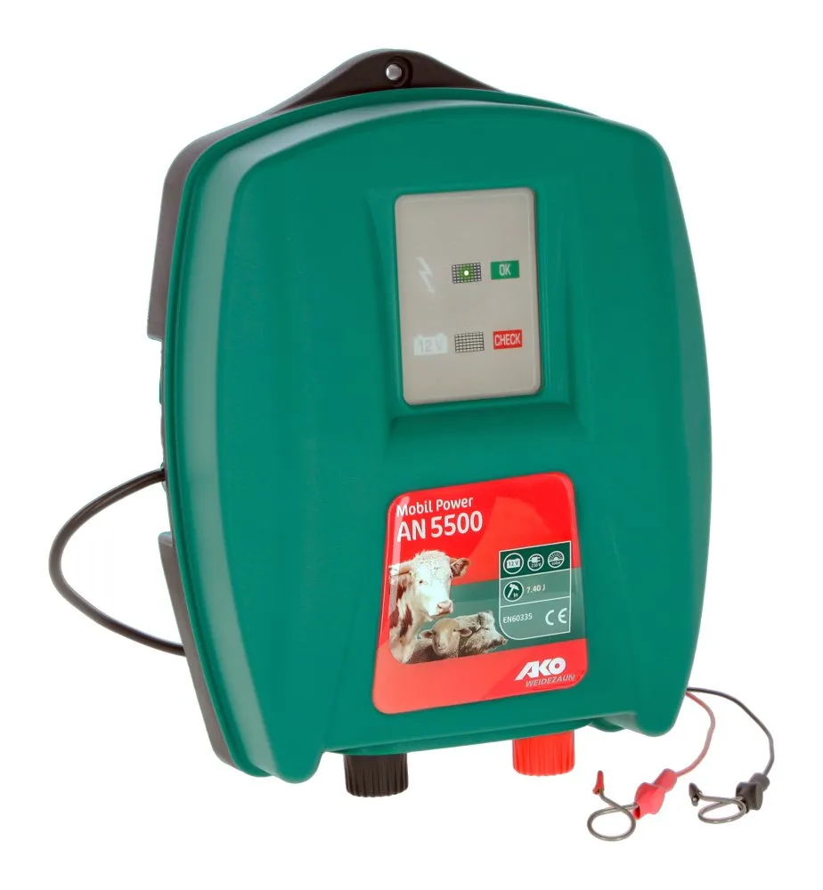 AKO Batteriaggregat AN 5500 är ett kraftfullt 12 V-batteriaggregat med hög effekt och flera praktiska funktioner för användning med långa elstängsel. Strömsparläge, urladdningsskydd, och optisk kontroll av spänning/laddningsnivå ger en komplett lösning. Med väderbeständigt hölje och tre års garanti klarar enheten utomhusmiljön problemfritt, samtidigt som den kan driva upp till 160 km stängsel med imponerande specifikationer såsom max.spänning på 13600 Volt och laddenergi på 9,8 Joule.