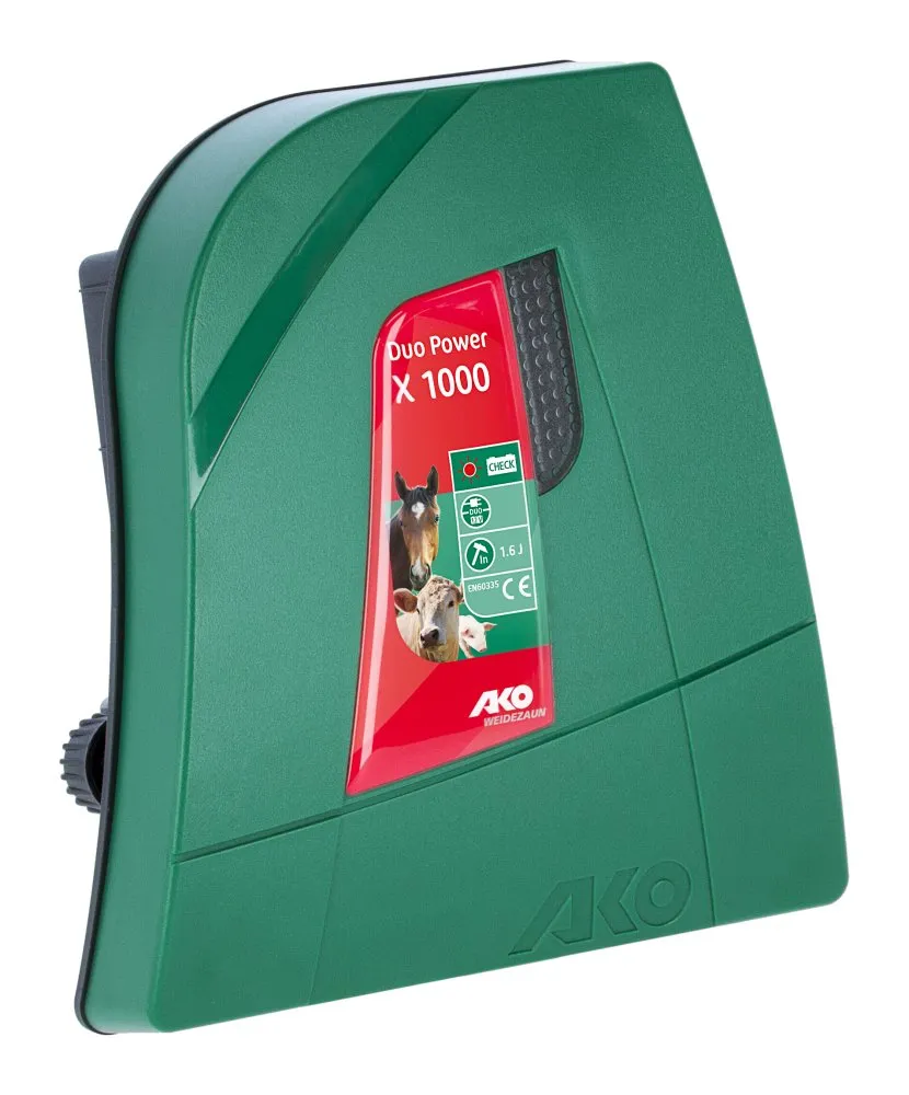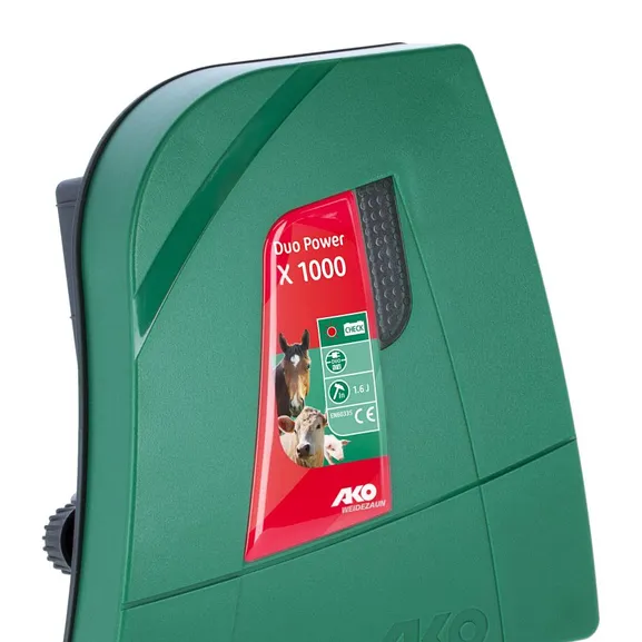 AKO Duo Power 2-in-1 Electric Fence Energizer X1000 is a reliable energizer for both stationary and mobile use. With a 230V power adapter and crocodile clips for connection to a 12V battery, it can be customized to your needs. Weather-resistant design allows for outdoor use with optimized power consumption and indicator light for function and battery level. Includes safety features like discharge protection at 12V operation and must be used in protected dry areas when using over 230V. Comes with fence and ground connection cables, backed by a three-year warranty for peace of mind. Max voltage:10500V, Max fence length:35km without vegetation/10km with sparse vegetation.