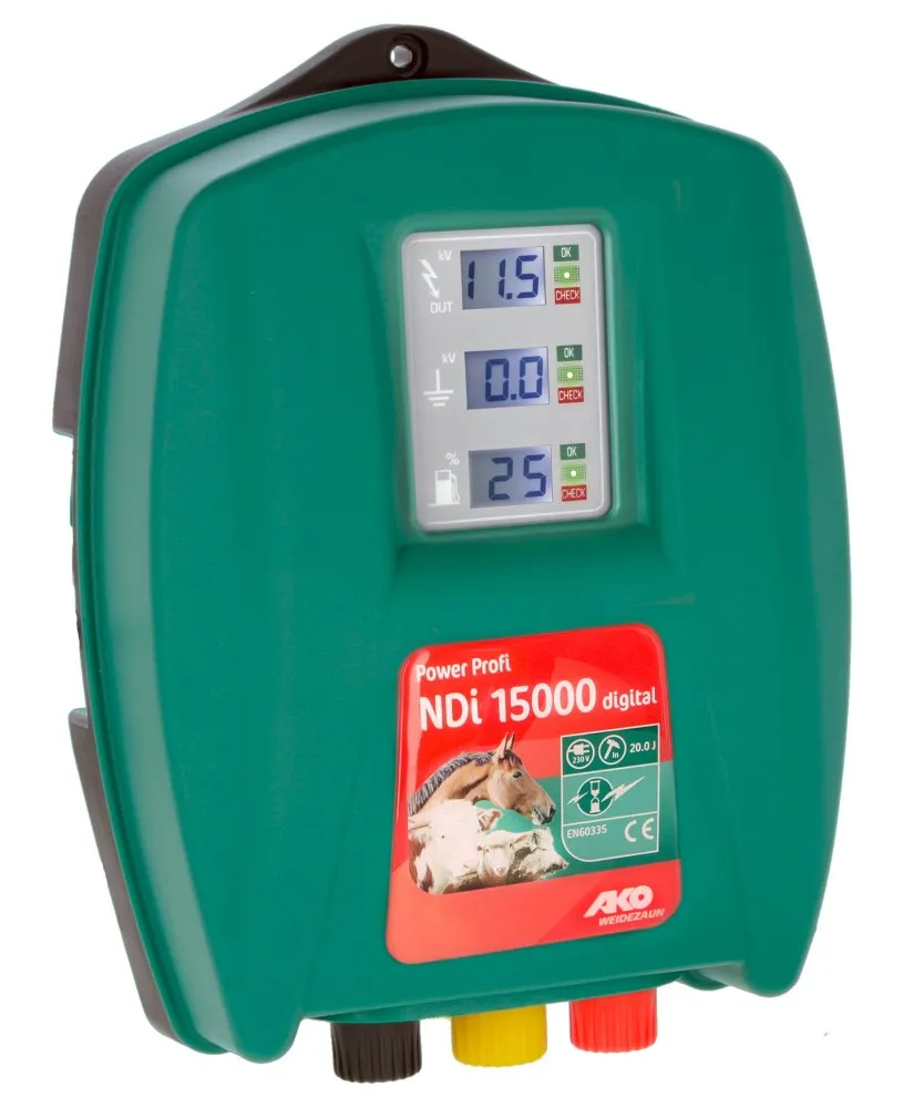 Ako Nätaggregat Power Profi Digital NDI 15000 är ett kraftfullt nätaggregat med digital display, speciellt designat för extra långa stängsel. Med imponerande kapacitet visar det stängselspänning, jordning och aktuell effekt i procent av maxeffekten. Kontrollamporna indikerar tydligt om stängsel och jordning är korrekta med grönt eller rött ljus. Tekniska specifikationer inkluderar en max spänning på 10200 Volt och laddenergi på 20 Joule för optimal prestanda i olika miljöer.