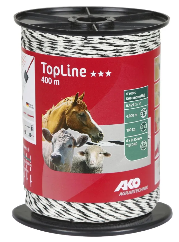 AKO Polytråd "TopLine Plus" i vit/svart är en högkvalitativ tråd med 6 x 0,25 mm TriCond ledare som sträcker sig över 400 meter och har ett motstånd på 0,42 Ohm/m. Galvaniserade TriCond-leddar med tre lager legering ger hållbarhet liknande rostfritt stål men med bättre ledningsförmåga.