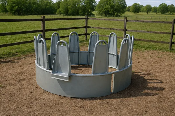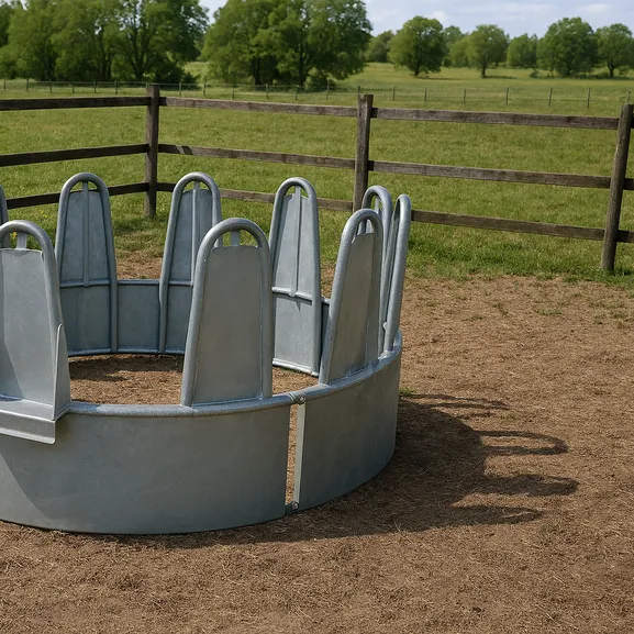 Ge dina hästar en trygg och praktisk utfodringsplats med vår runda, galvaniserade foderhäck. Den öppna designen gör det enkelt för flera hästar att äta samtidigt, vilket minskar konkurrens och stress i flocken.