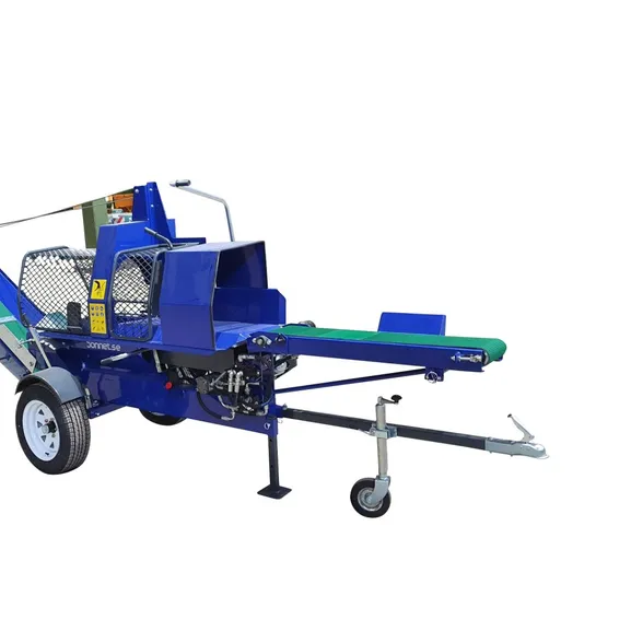 -Rullande inmatarbandet kan också fällas upp för transport och förvaring. Även dragstången på vedmaskinen är avtagbar.