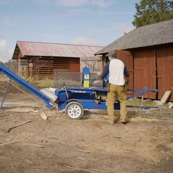 Bonnet Vedkombi 330 ET är en effektiv och användarvänlig vedklyvningsmaskin med inbyggd elevator. Denna maskin kapar och klyver stocken i ett moment, vilket gör den till en praktisk lösning för att hantera ved. Med en kapacitet på cirka 5 m3/h kan du bearbeta vedlängder upp till 53 cm och stockdiametrar upp till 33 cm.